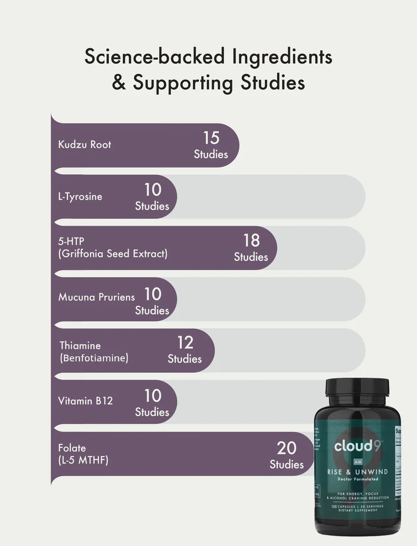 Rise and Unwind AM is a doctor-formulated supplement designed to reduce alcohol cravings, boost energy, and stabilize mood throughout the day. It helps your body rebalance by replenishing essential nutrients and supporting neurotransmitter function, making it easier to manage the desire for alcohol.